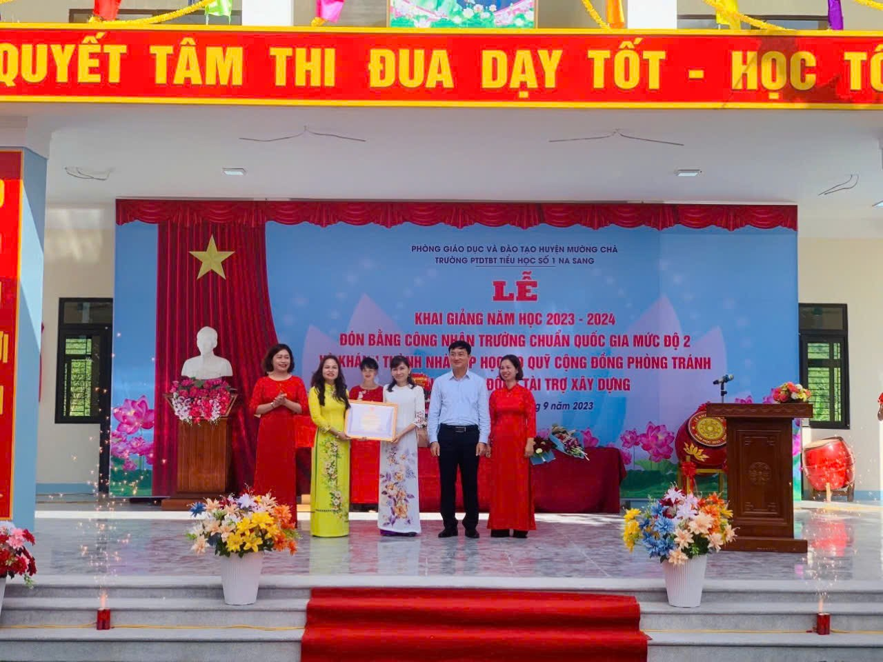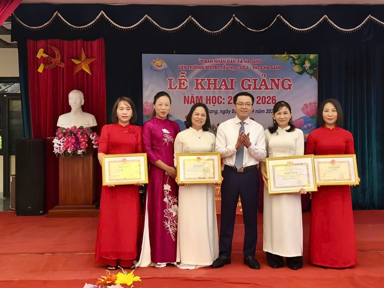 Ảnh: Đồng chí Trịnh Hoàng Thắng – tỉnh uỷ viên – Bí thư Đảng uỷ xã Na Sang tặng Bằng khen tập thể CBGV nhà trường.