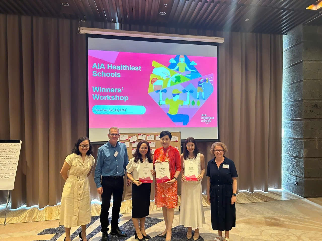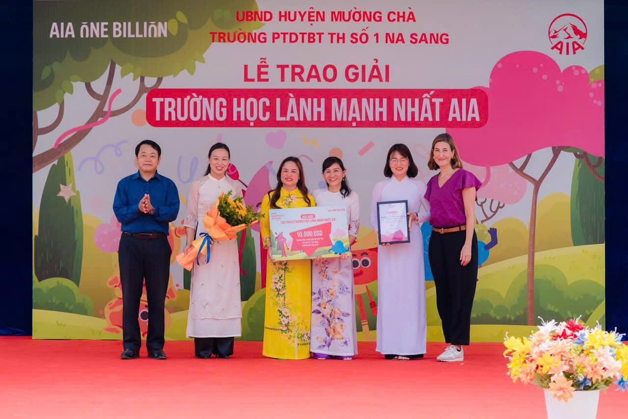 Ảnh: Đ.C Phạm Thị Thu Hằng và đại diện CBGV nhận giải Nhất cuộc thi Trường học lành mạnh nhất do AIA tổ chức