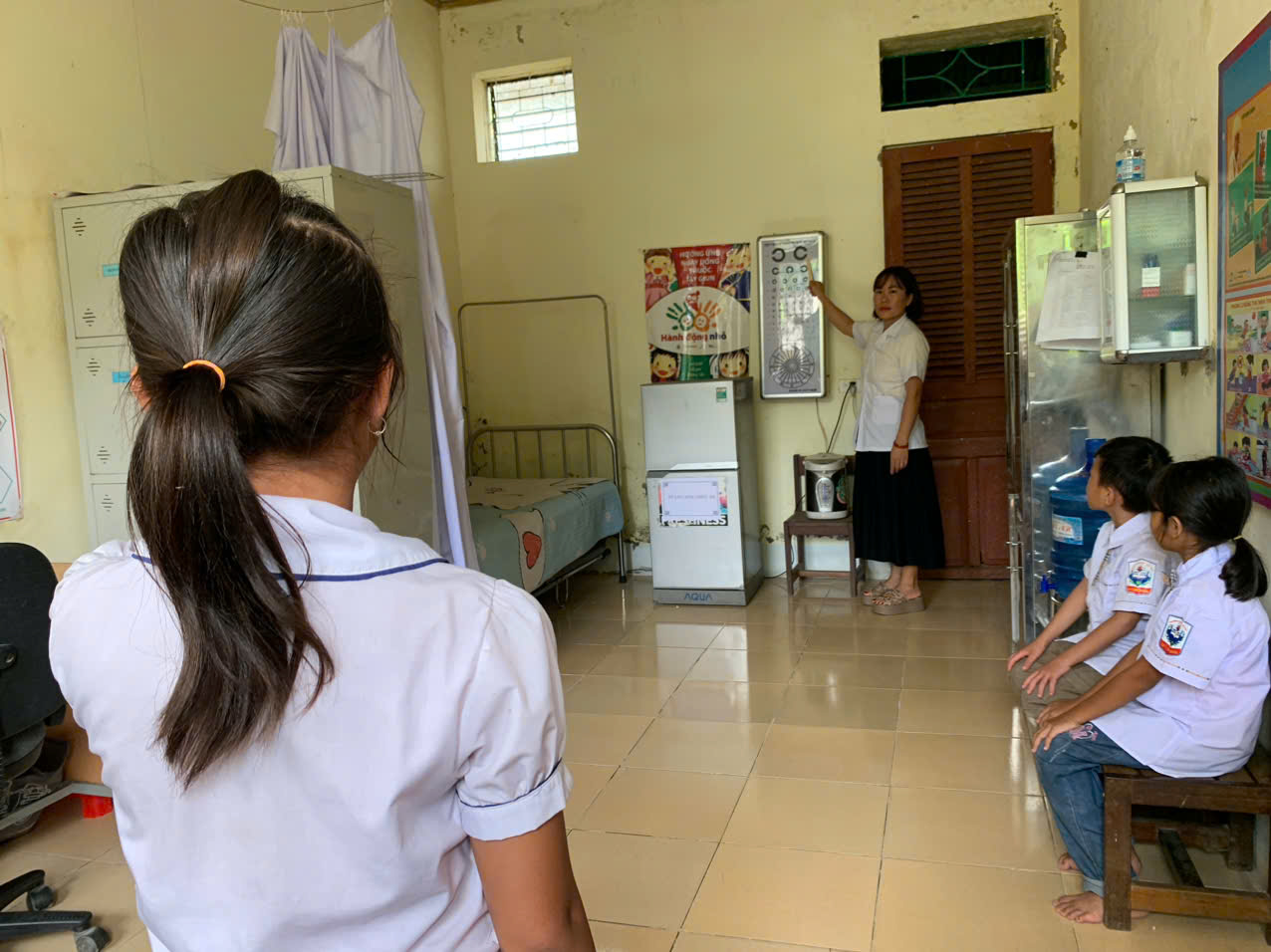 Hình ảnh: Nhân viên y tế khám thị lực cho học sinh trong trường