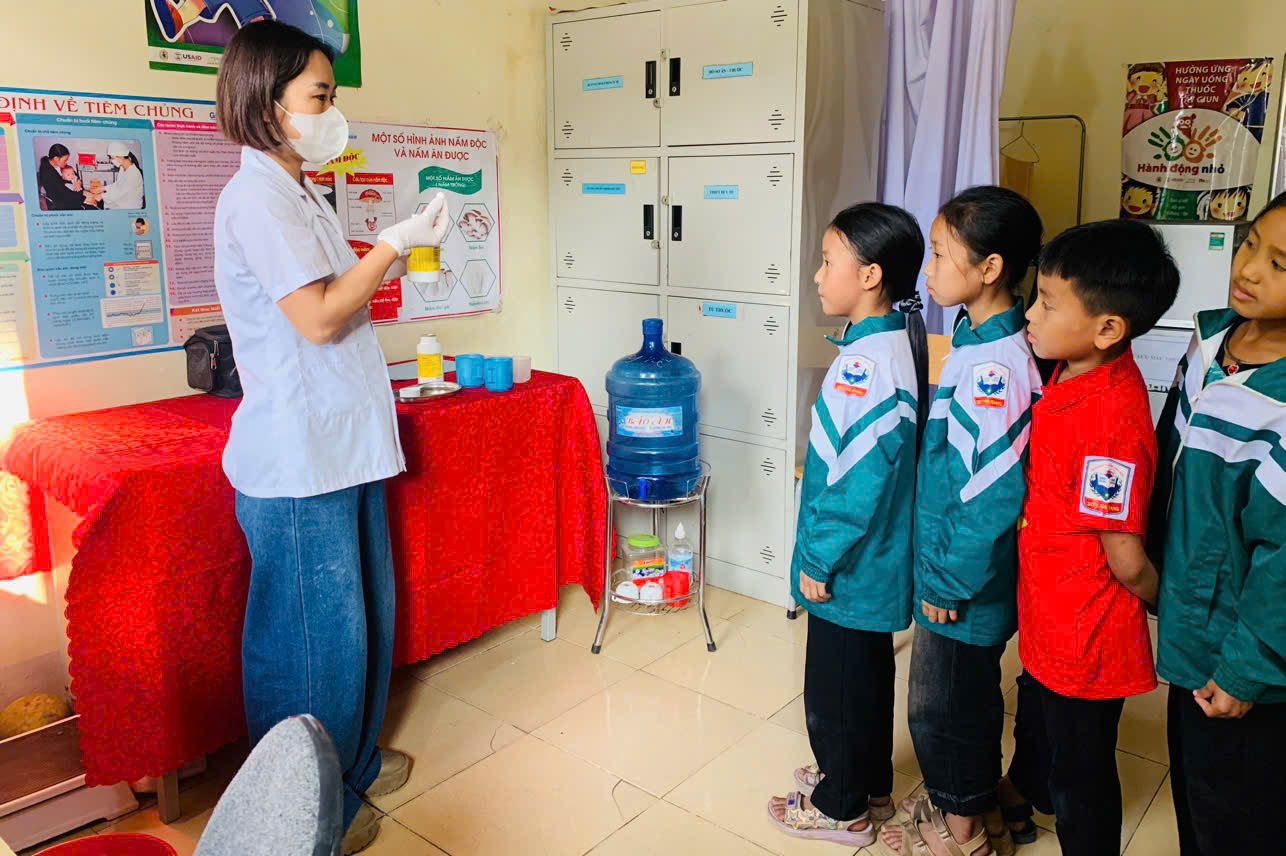 Hình ảnh: Nhân viên y tế phát thuốc tẩy giun cho từng học sinh uống tại phòng y tế