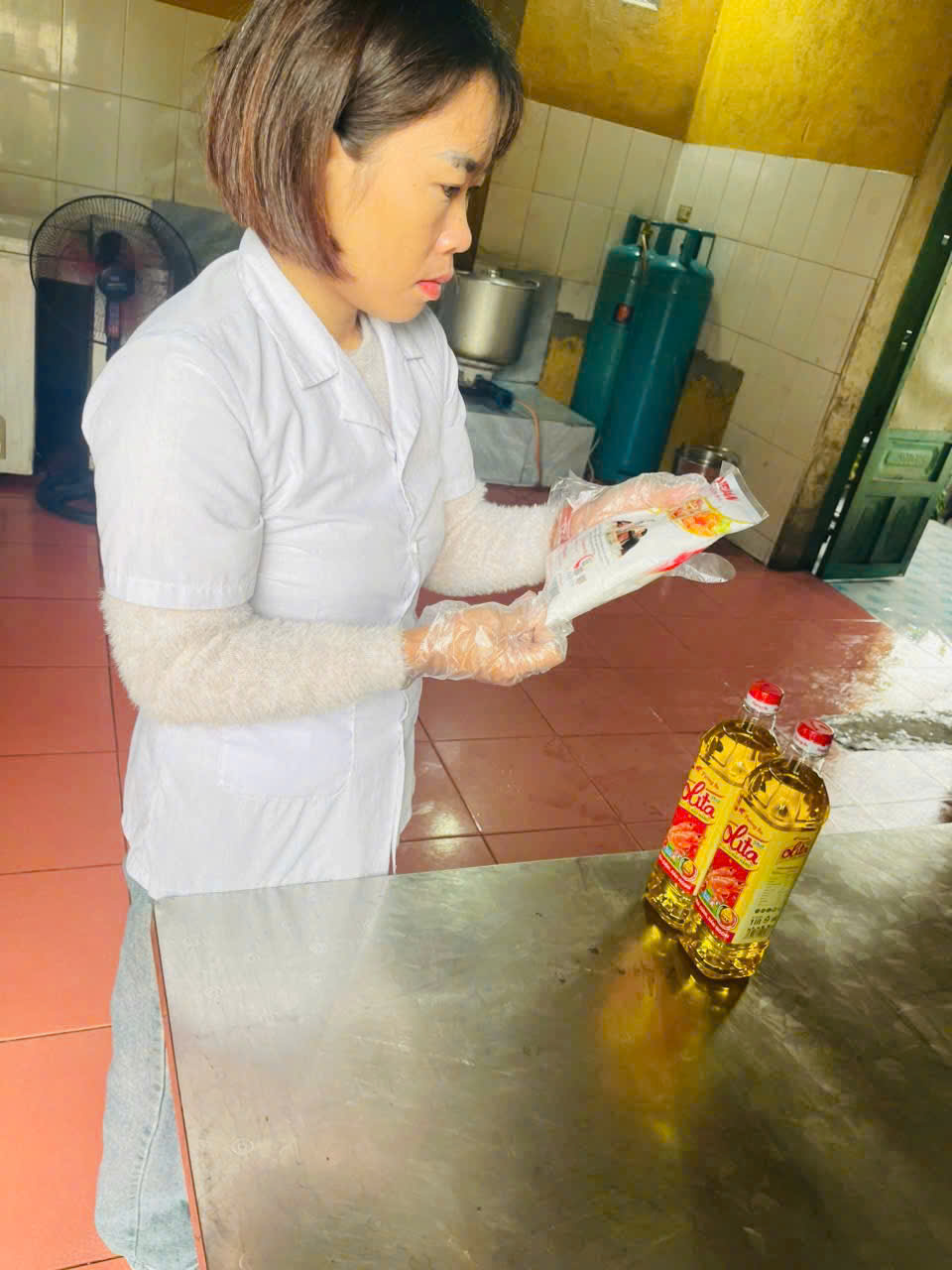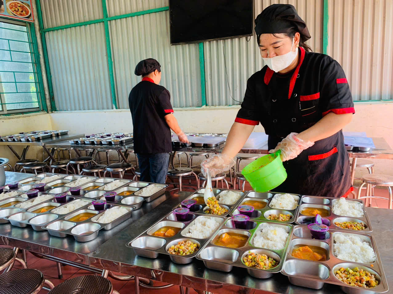 Hình ảnh: Chia suất ăn cho học sinh đúng quy trình, đảm bảo vệ sinh an toàn thực phẩm.